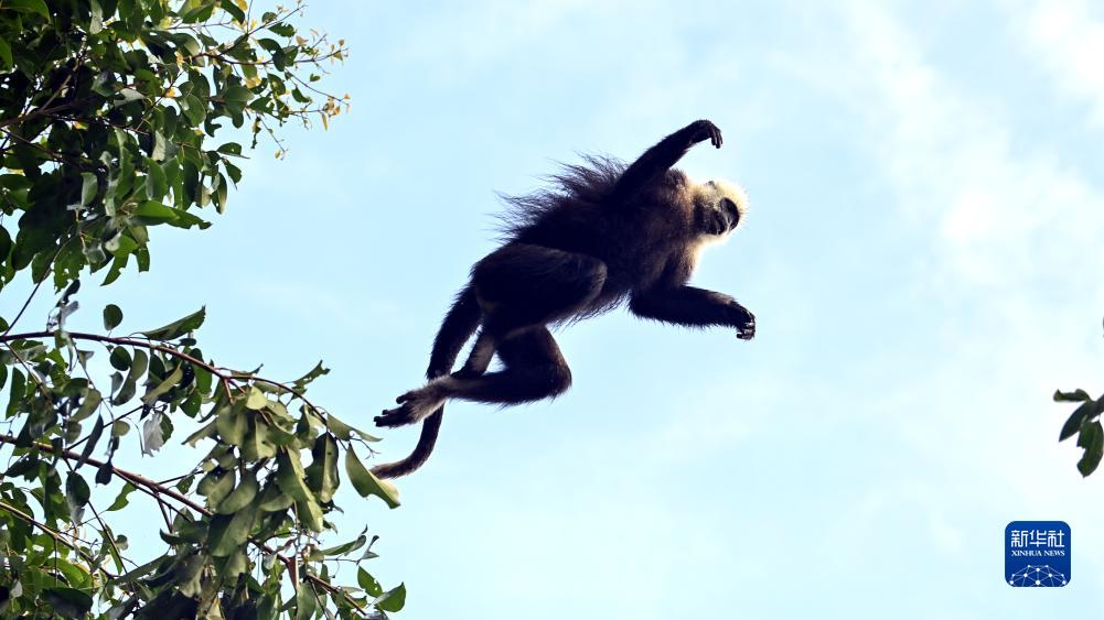 一隻白頭葉猴在林間跳躍(8月5日攝)。