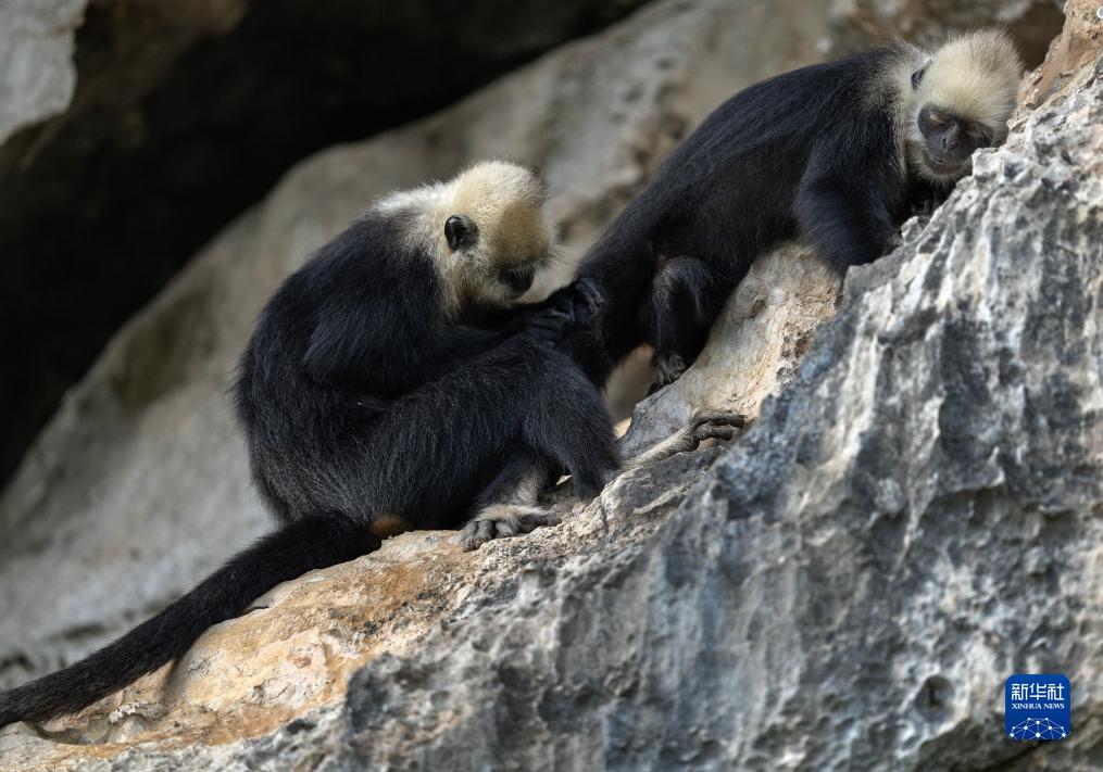 白頭葉猴,頭頂高聳着一撮白毛,是我國特有的國家一級重點保護野生動物,種群數量稀少,主要分佈在廣西崇左市左江和明江之間約200平方公里的喀斯特石山地區。白頭葉猴還有個好聽的名字——“石山精靈”。