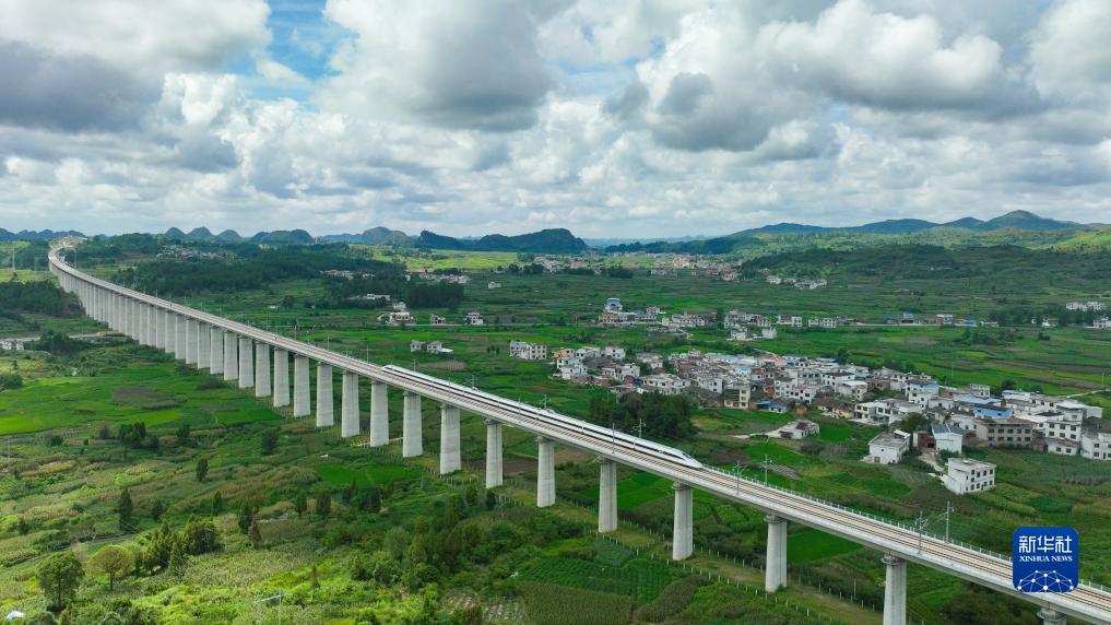 試驗動車組經過位於貴州省獨山縣的貴南高鐵拉裏雙線特大橋(8月2日攝)。