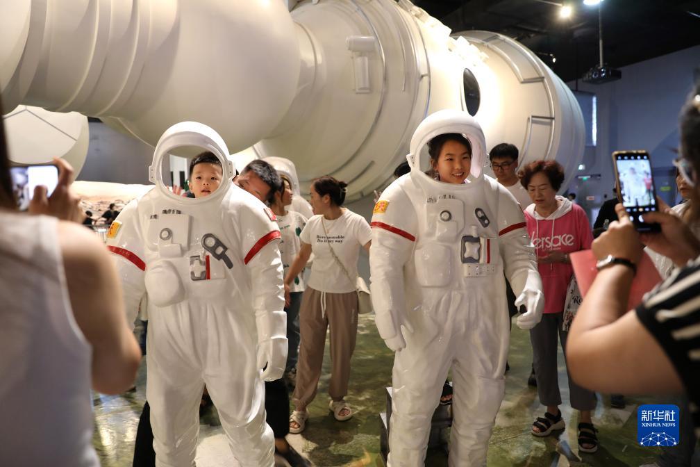 8月6日,小朋友們在位於瀋陽市的遼寧省科技館裏航天展區參觀留影。