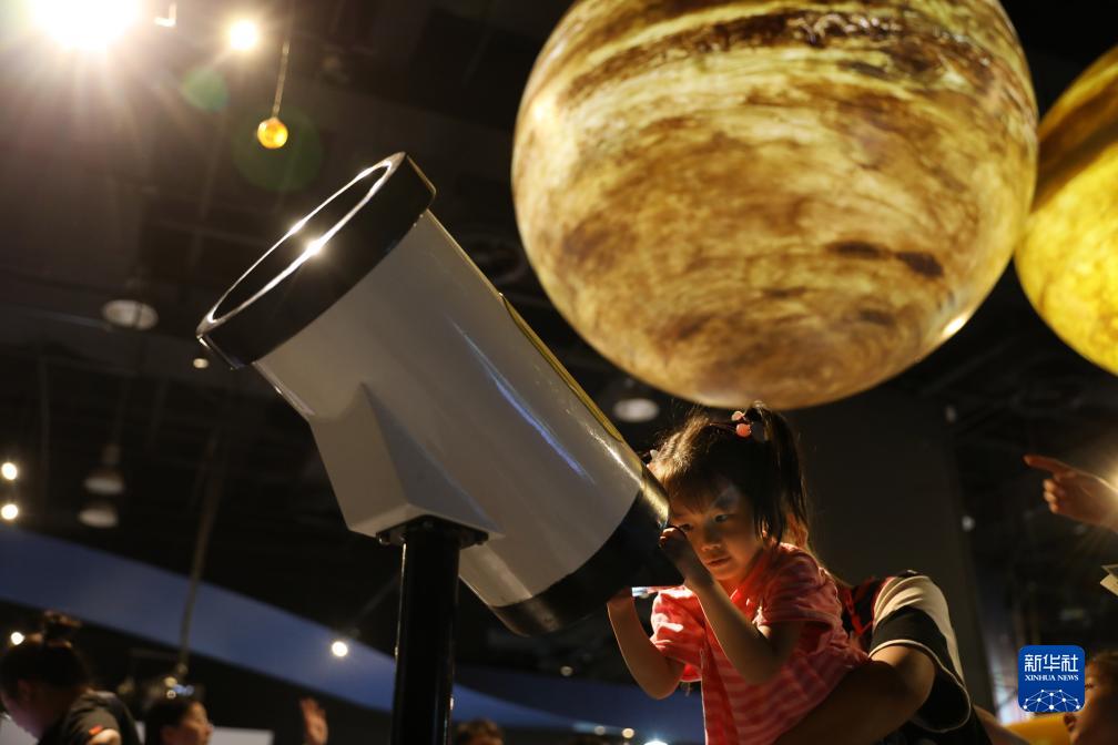 8月6日,一名小朋友在位於瀋陽市的遼寧省科技館裏體驗望遠鏡。
