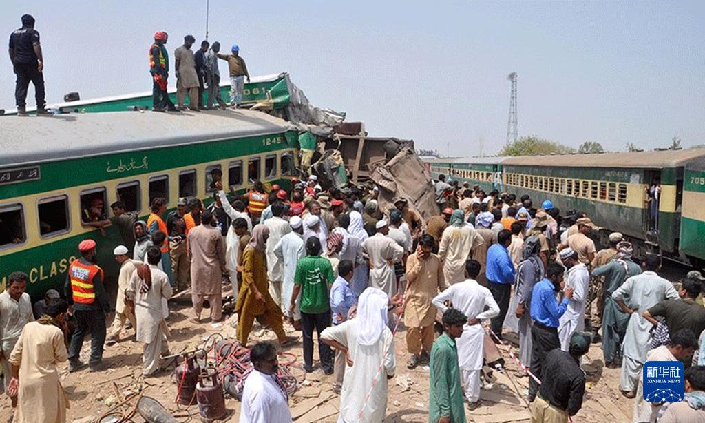 8月6日,人們聚集在巴基斯坦南部信德省桑克爾地區的列車脫軌事故現場。