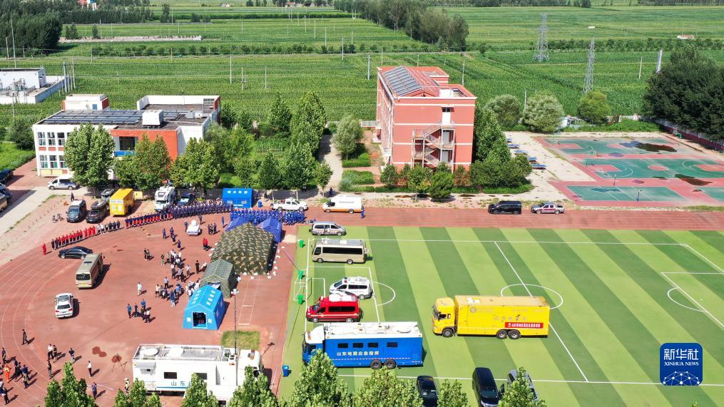 8月6日,在平原縣王打卦中心小學,應急救援隊伍集結待命(無人機照片)。