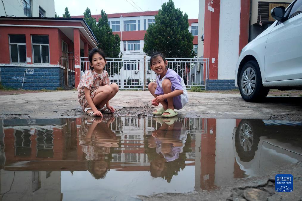 8月6日,在平原縣王打卦鎮,兩名小朋友在水邊玩耍。