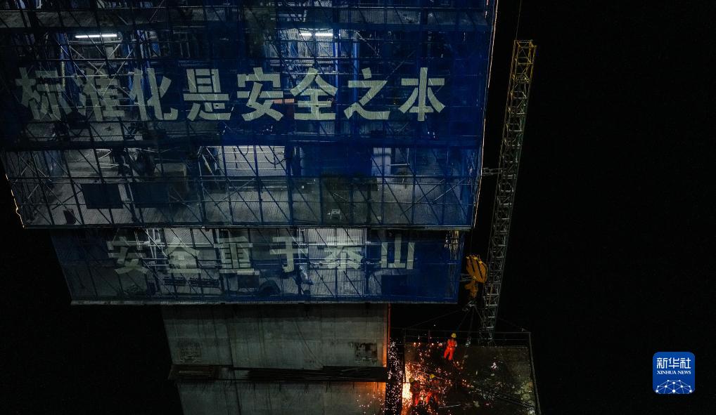 貴州公路集團工人在花江峽谷大橋5號主塔進行夜間施工(8月2日攝)。