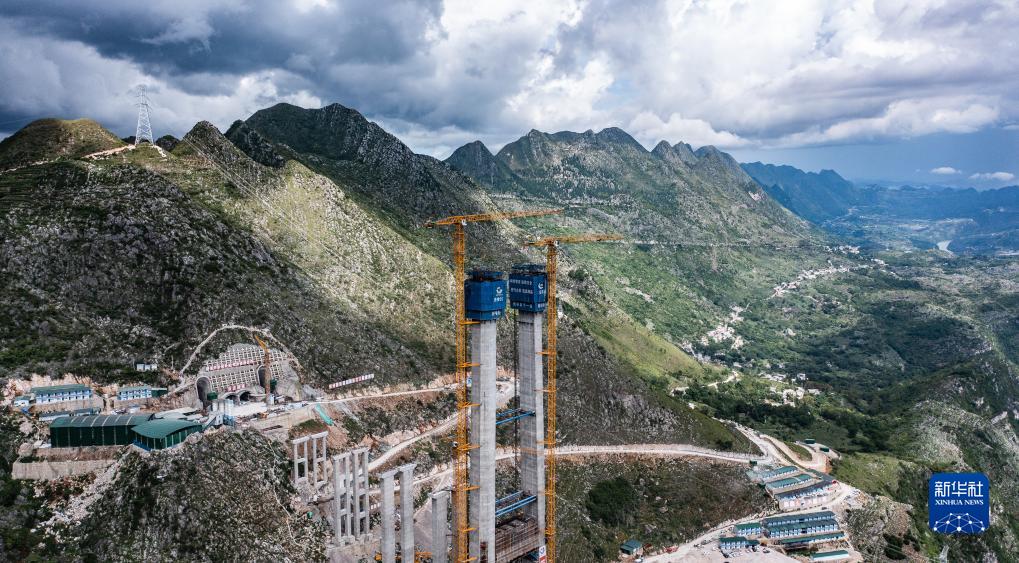 正在修建中的花江峽谷大橋5號主塔(8月2日攝,無人機照片)。
