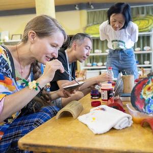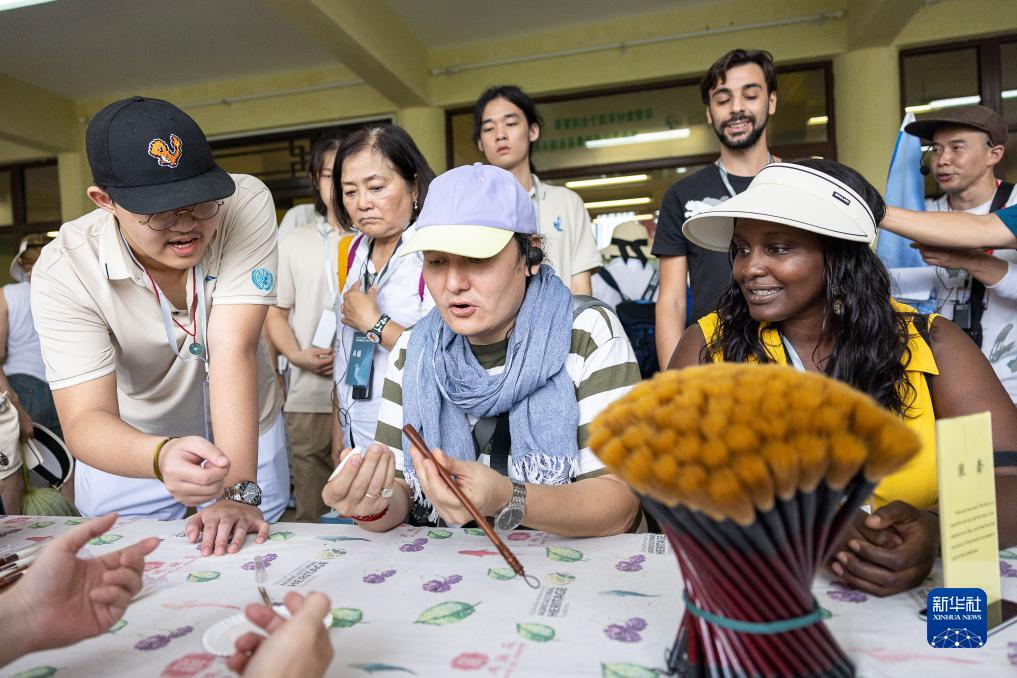 8月6日,在浙江省湖州市南潯區和孚鎮,外國友人體驗湖筆製作技藝。