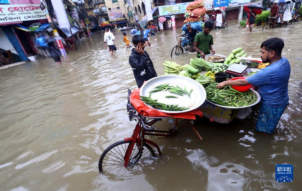 8月6日,商販在孟加拉國吉大港一處積水的街區售賣蔬菜。