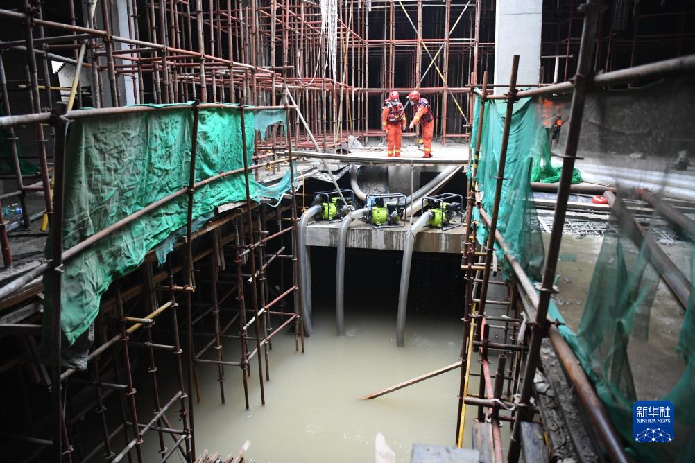 8月7日,邢&市消防救援支隊隊員在河北省涿州市一處工地查看排澇作業情況。