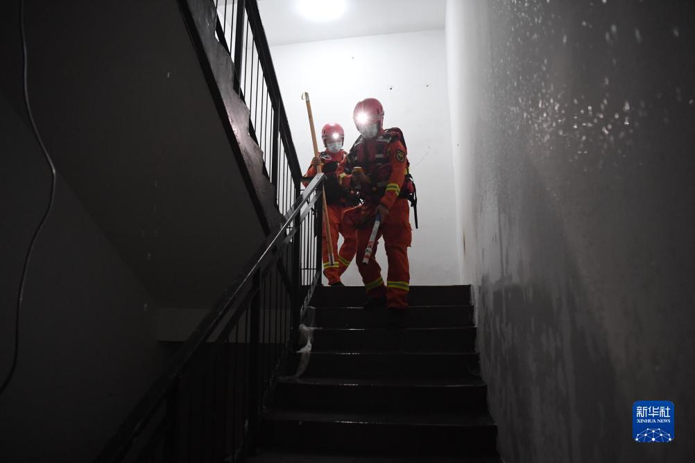 8月7日,邢&市消防救援支隊隊員在河北省涿州市一處寫字樓地庫查看積水情況。