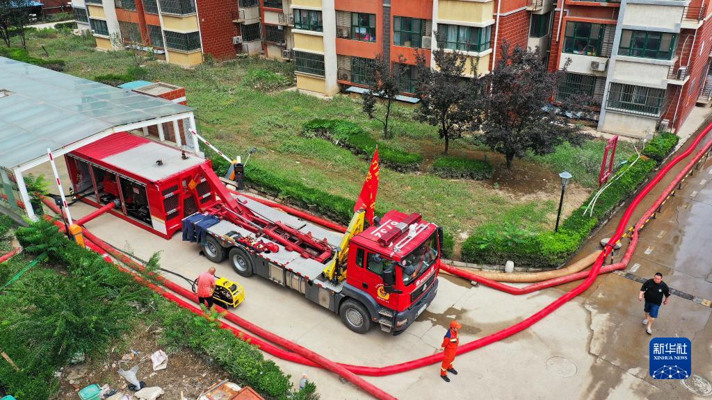 8月7日,邯鄲市消防救援支隊排水設備在河北省涿州市一小區地下車庫排澇現場作業(無人機照片)。