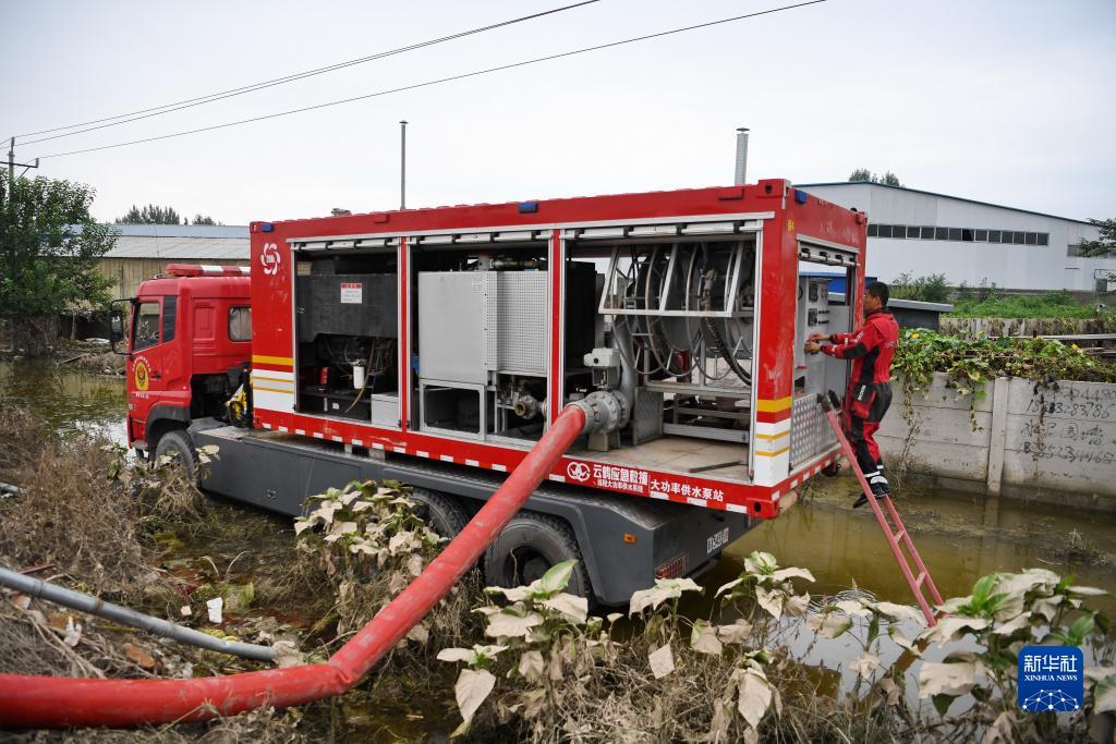 8月7日,保定市消防救援支隊隊員在河北省涿州市林家屯鎮梁家墳村進行排澇作業。