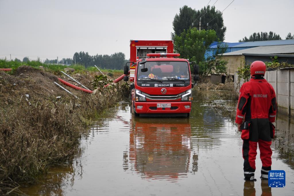 8月7日,保定市消防救援支隊隊員在河北省涿州市林家屯鎮梁家墳村進行排澇作業。