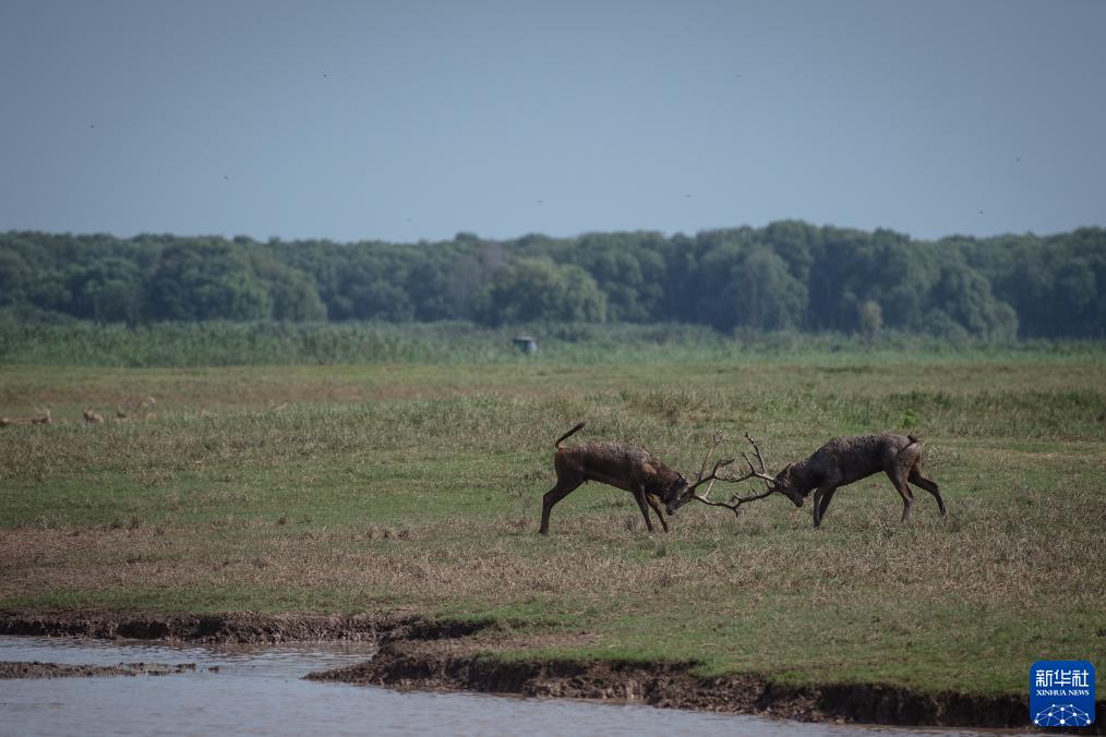 8月1日,兩頭雄鹿在湖北石首麋鹿國家級自然保護區內爭鬥。