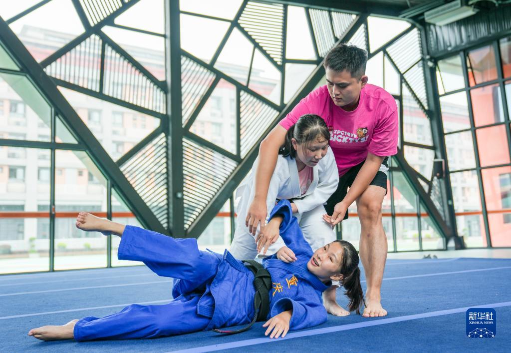 8月4日,重慶市特殊教育中心柔道隊隊員在教練劉祖宇(右一)指導下進行訓練。