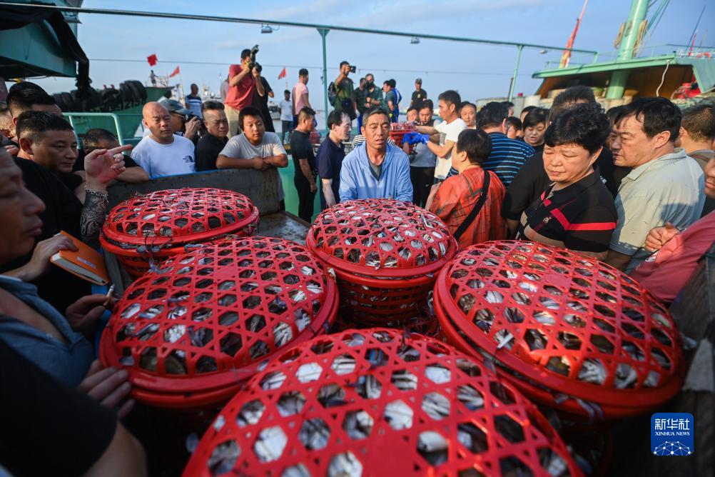 8月7日首批開漁歸來的漁運船靠泊在舟山普陀沈家門舟山國際水産城碼頭,漁民把整筐的梭子蟹運送上岸裝車。