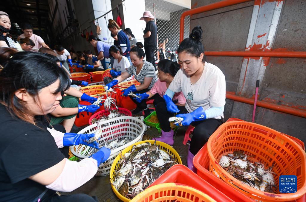 8月7日,舟山普陀沈家門舟山國際水産城的商戶們在分揀、綁扎開漁捕撈上來的首批梭子蟹,然後發往各地市場。
