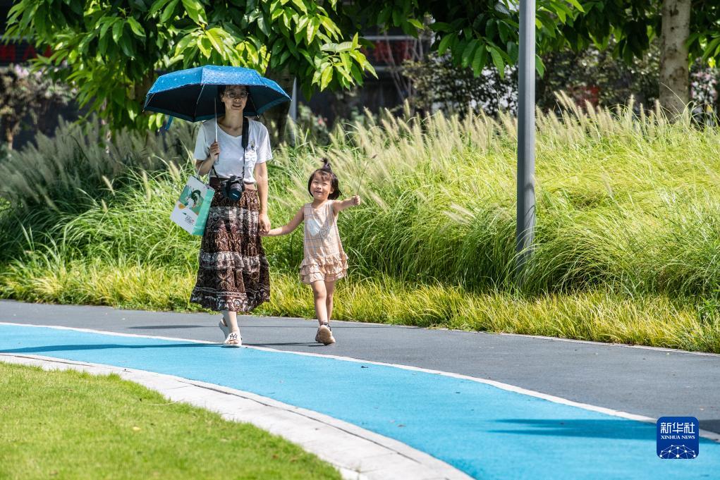 8月6日,在位於重慶長江岸邊的珊瑚公園,市民在散步。