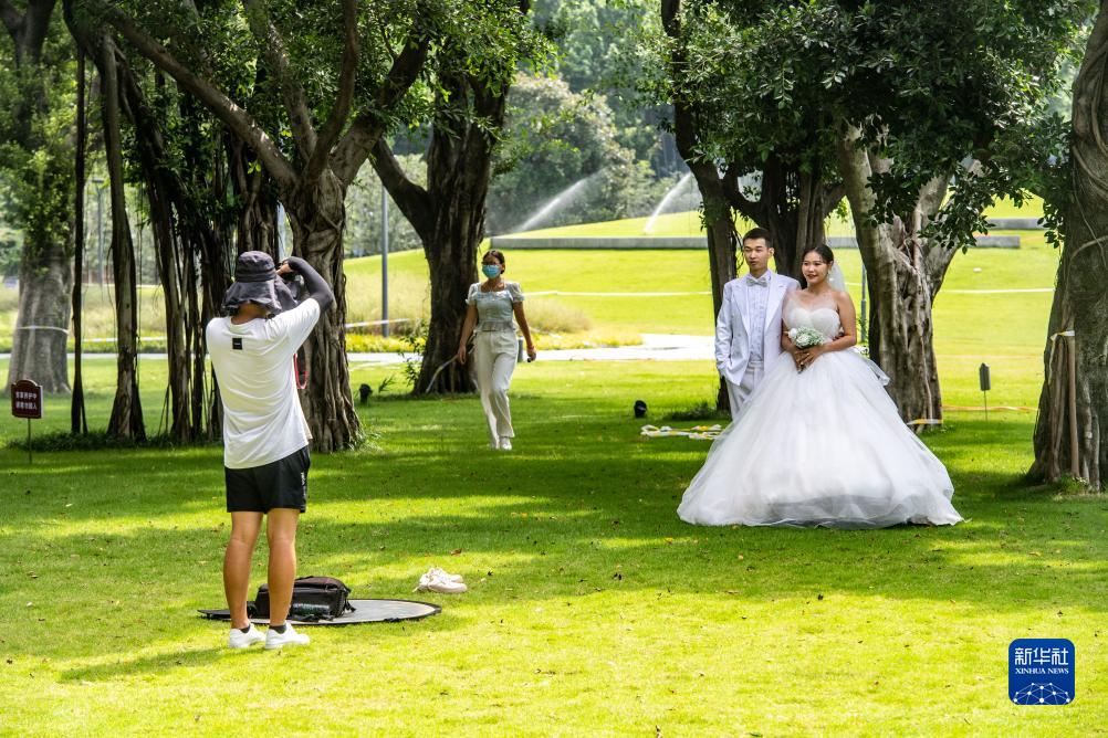 8月6日,在位於重慶長江岸邊的珊瑚公園,新人在拍攝婚紗照。