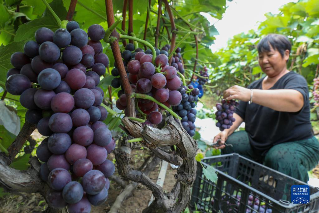 8月7日,在河南省寶豐縣張八橋鎮袁店村一處葡萄種植園,農民在採摘葡萄。