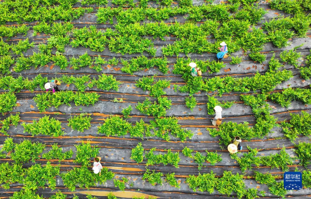 8月7日,在湖南省張家界市武陵源區金杜村莓茶種植基地,茶農在採摘鮮葉(無人機照片)。