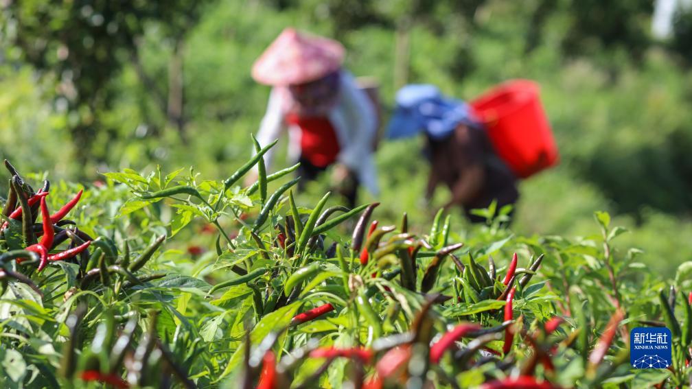 8月7日,在貴州省劍河縣南哨鎮九當村辣椒基地,村民在採摘辣椒。
