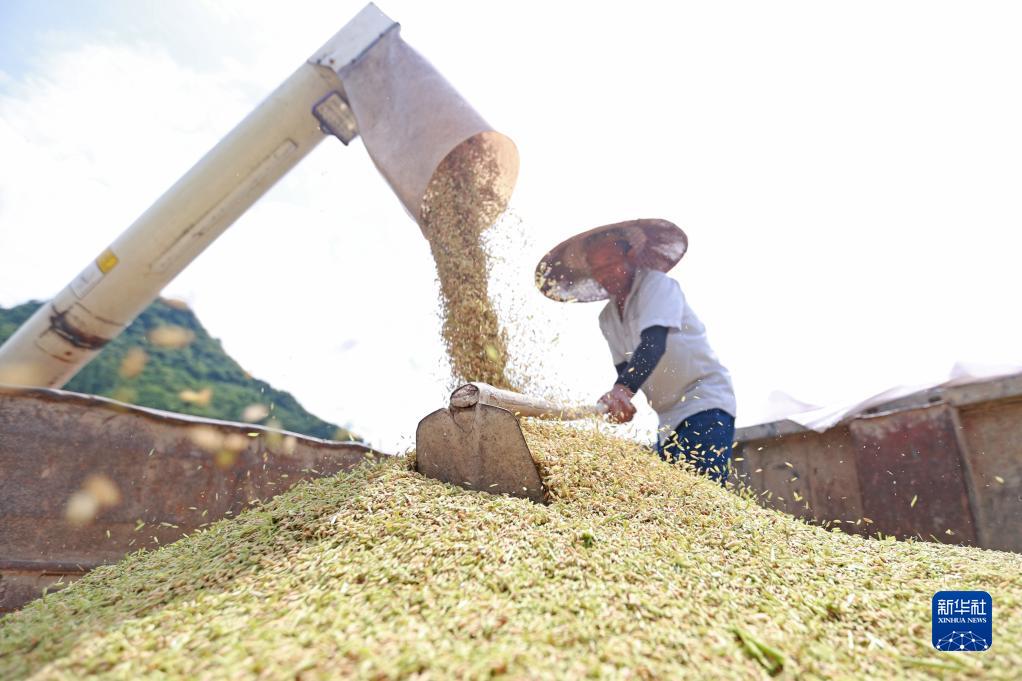 8月7日,在貴州省岑鞏縣注溪鎮六部屯村雜交水稻制種基地,村民在將收穫的水稻裝車。