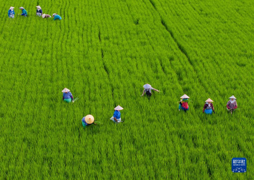 8月7日,在江蘇省昆山市陸家未來智慧田園現代農業園區,村民在水稻田清除雜草(無人機照片)。
