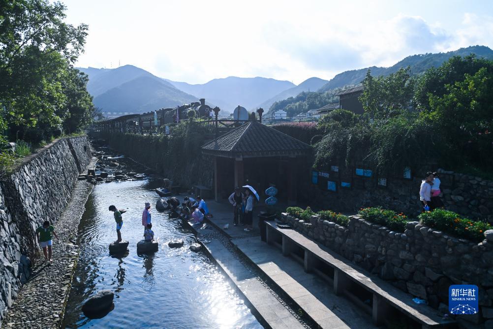 8月7日,游客在舟山市定海區新建村的小溪裏感受清涼。新建村被評為中國最美休閒鄉村、全國鄉村旅游重點村等榮譽稱號。