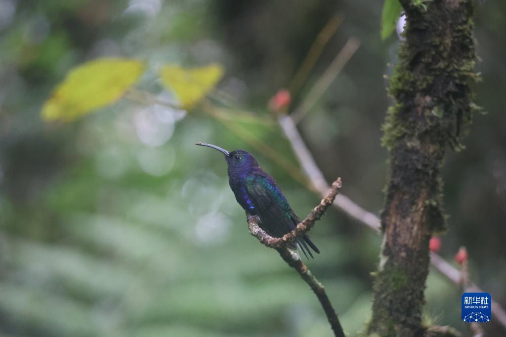 7月24日,哥斯達黎加蒙特韋德雲霧森林生物保護區的一隻紫刀翅蜂鳥停在林中。