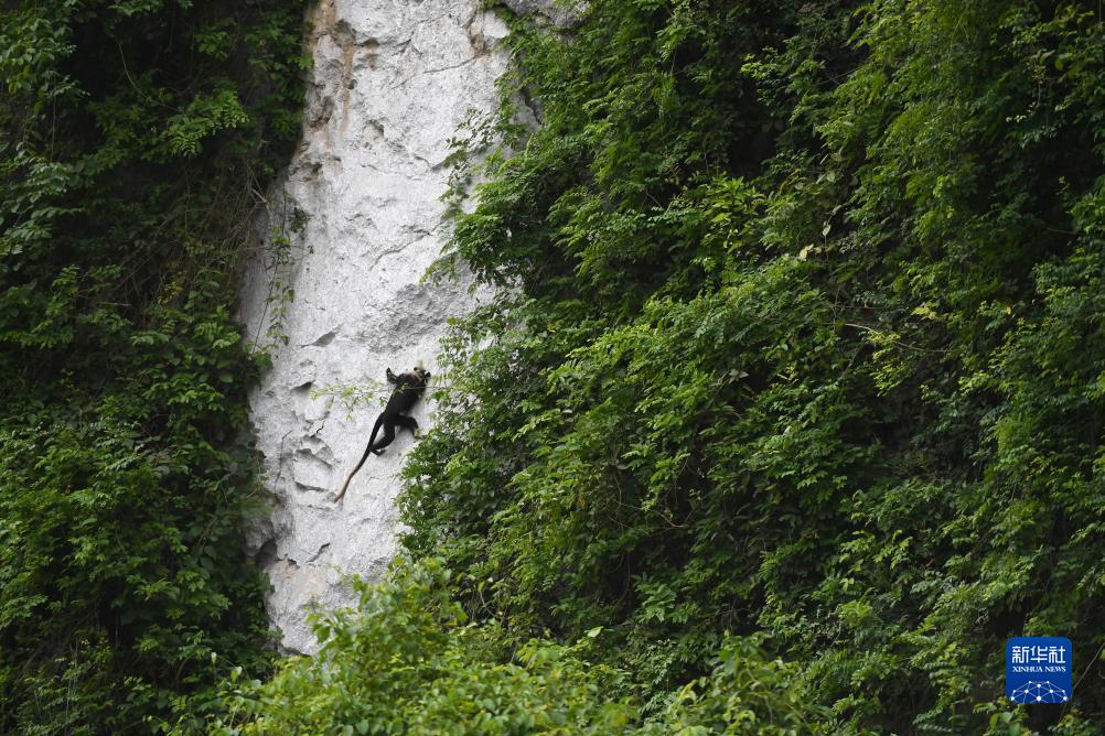 一隻白頭葉猴在石壁上攀爬(8月5日攝)。