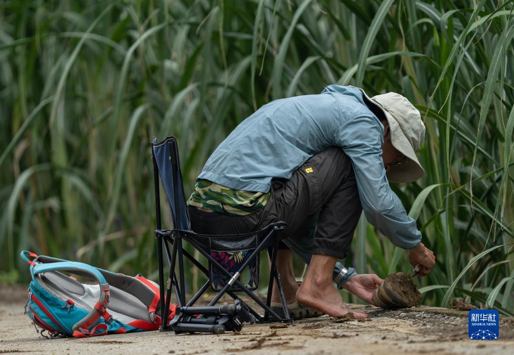 8月5日,李文欽從樹林中出來後,清理沾在鞋上的泥巴。