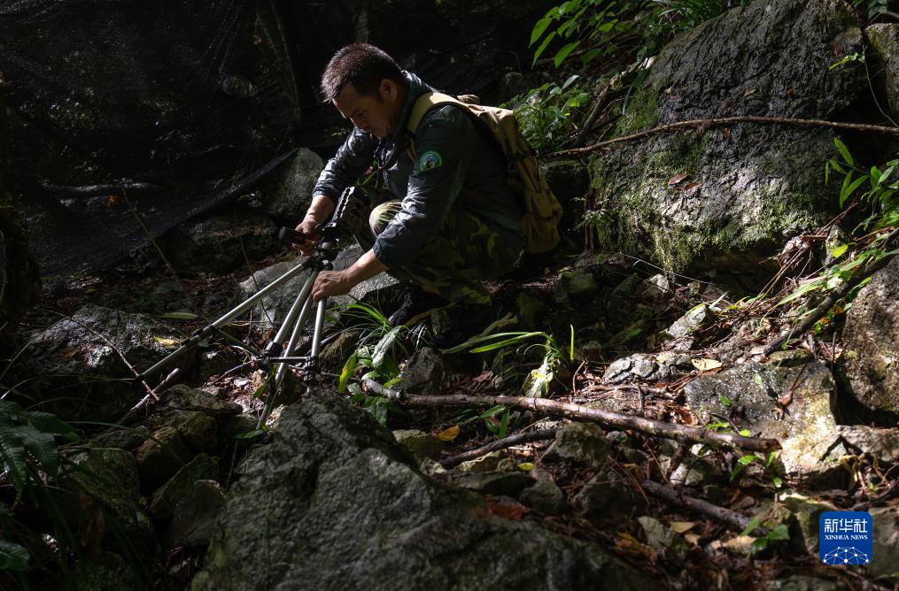 8月4日,梁志章在保護區巡視時,把被撞倒的紅外線相機扶起來。