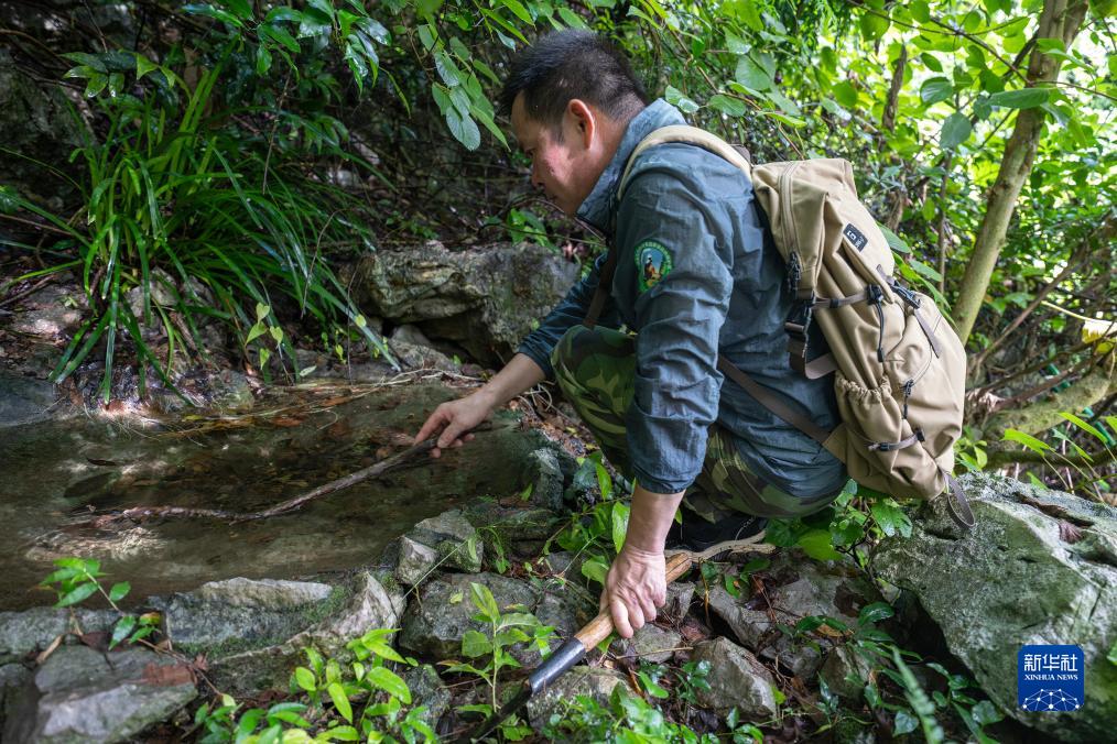8月4日,梁志章在保護區巡視時,清理專門為白頭葉猴修的飲水池。