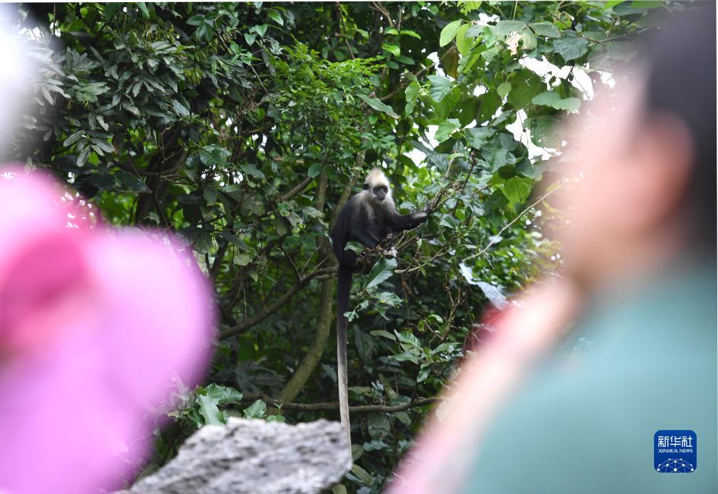 游客近距離觀看猴群活動(8月5日攝)。