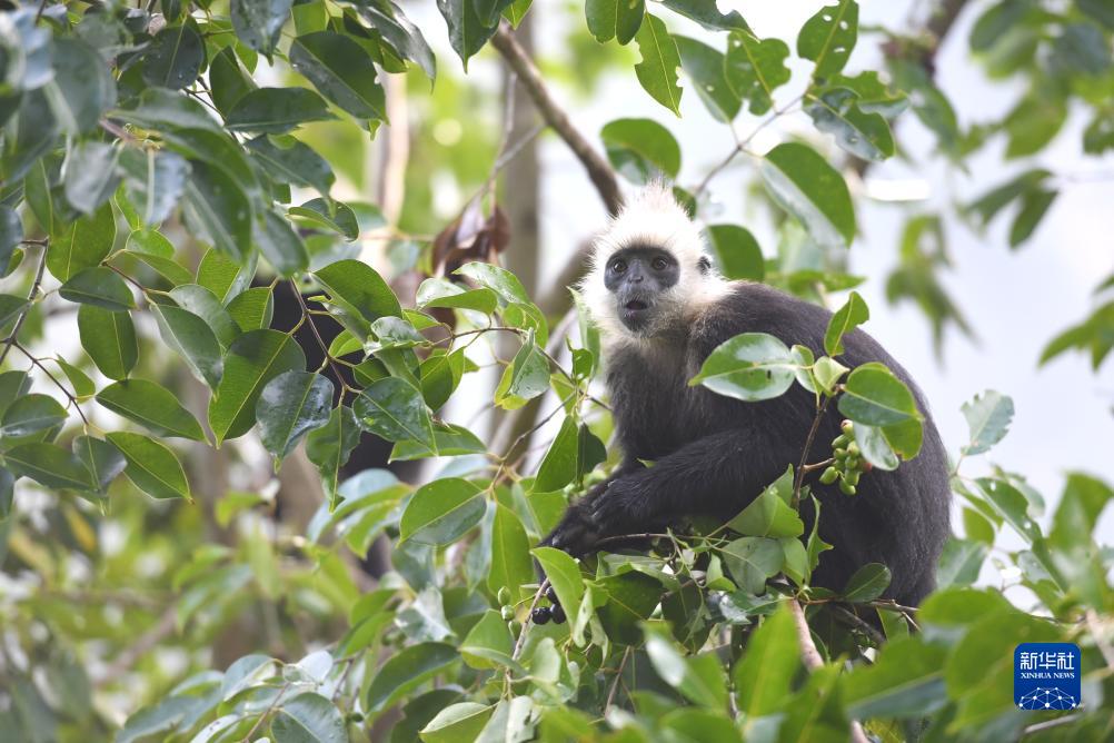 一隻白頭葉猴在樹林裏覓食(8月5日攝)。