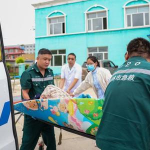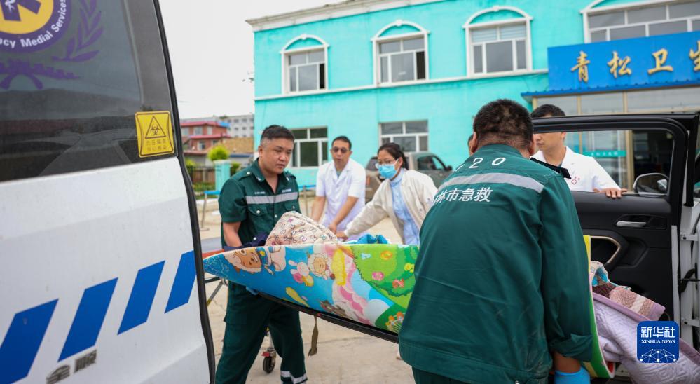 8月6日,舒蘭市青松衞生院醫護人員將受困群眾運送至醫院。