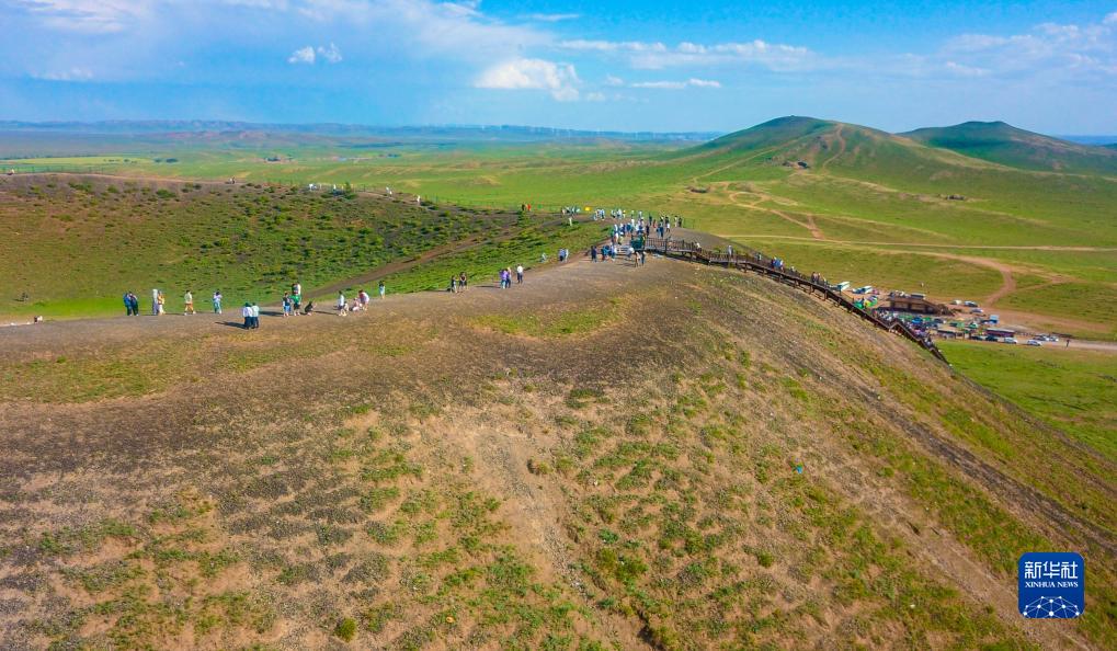 8月6日,游客在烏蘭察布市察哈爾右翼後旗草原上的火山上游覽(無人機照片)。