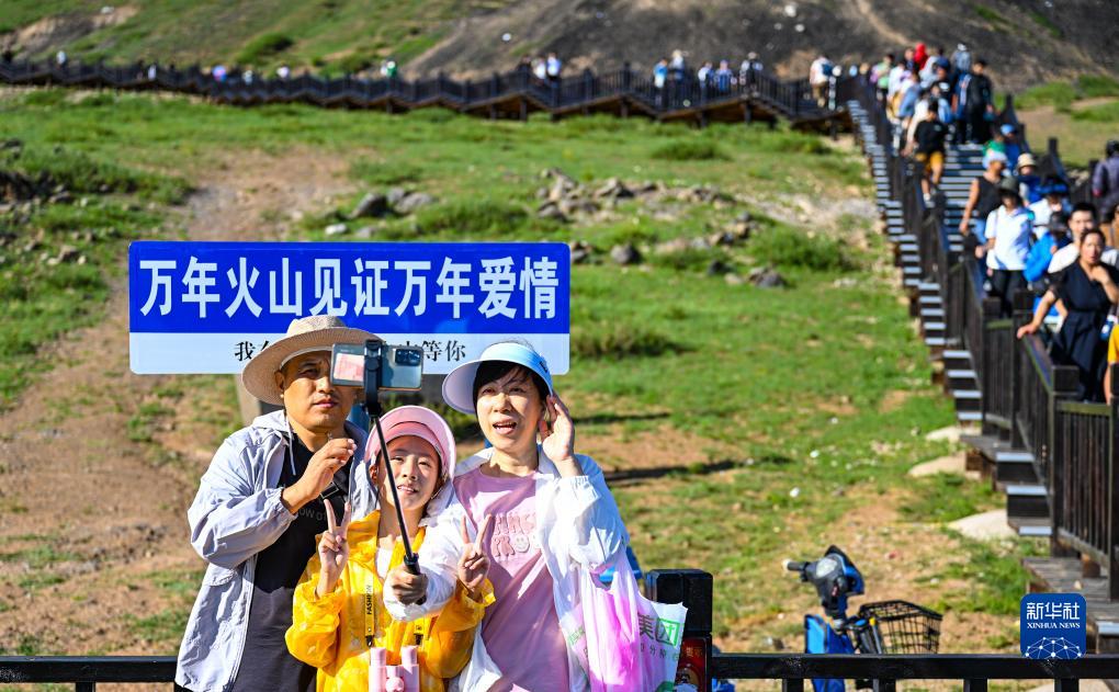 8月6日,游客在烏蘭察布市察哈爾右翼後旗草原上的火山前合影留念。