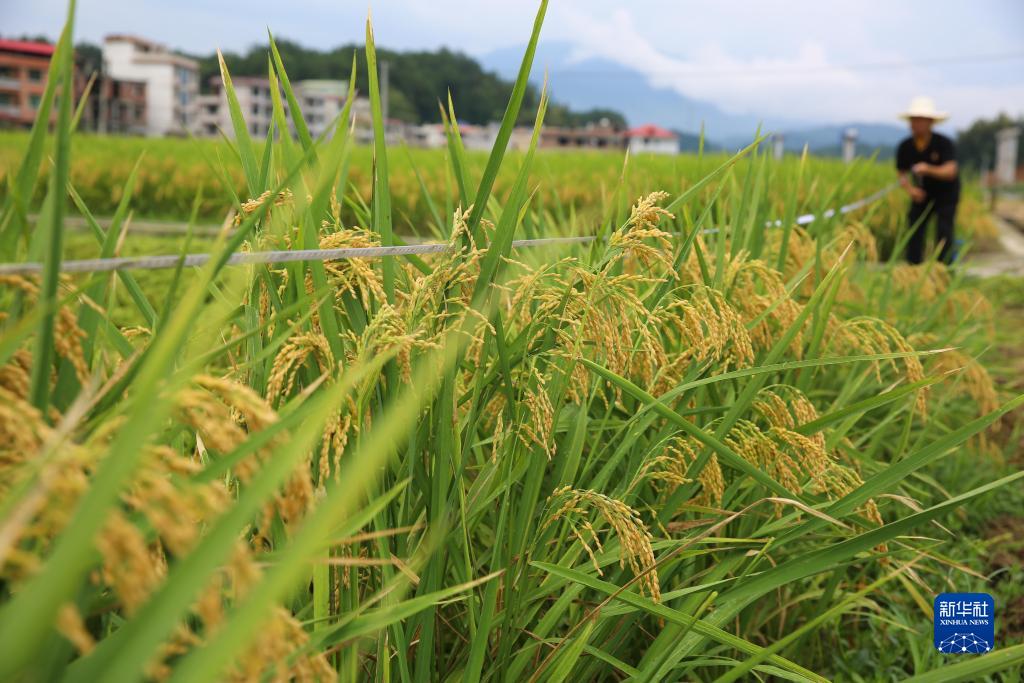 8月7日,在湖南省邵陽市隆回縣羊古坳鎮雷峰村超級雜交水稻高産攻關科研基地,技術人員測量稻田面積。
