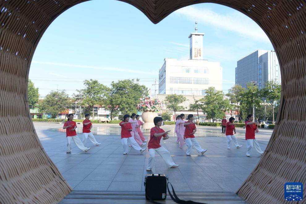 8月8日,山東省臨沂市臨沭縣文化廣場太極團隊在文化廣場展示太極拳。