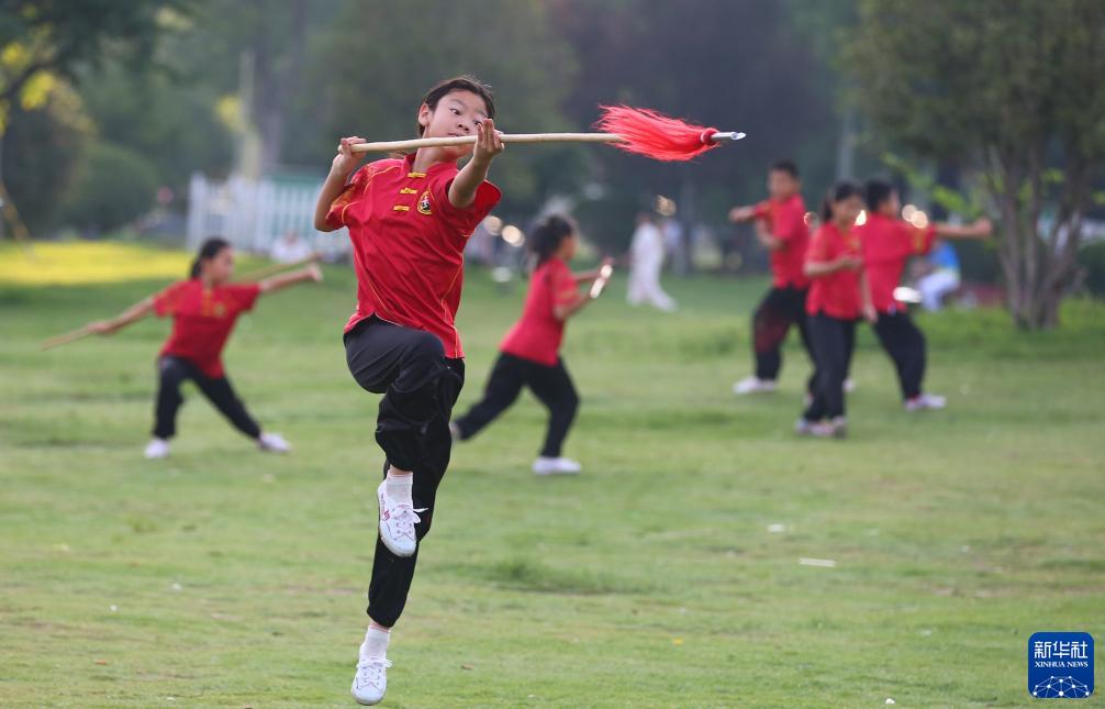 8月8日,在山東省滕州市市民公園,孩子們在練習武術。