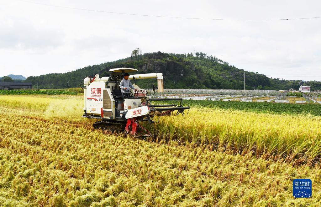 8月8日,村民在湖南省永州市江永縣千家峒瑤族鄉鳳岩山村駕駛收割機搶收中稻。
