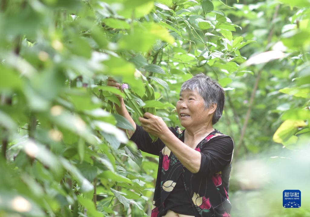 8月8日,在湖南省婁底市雙峰縣永豐街道白杉村,農民在採摘刀豆。