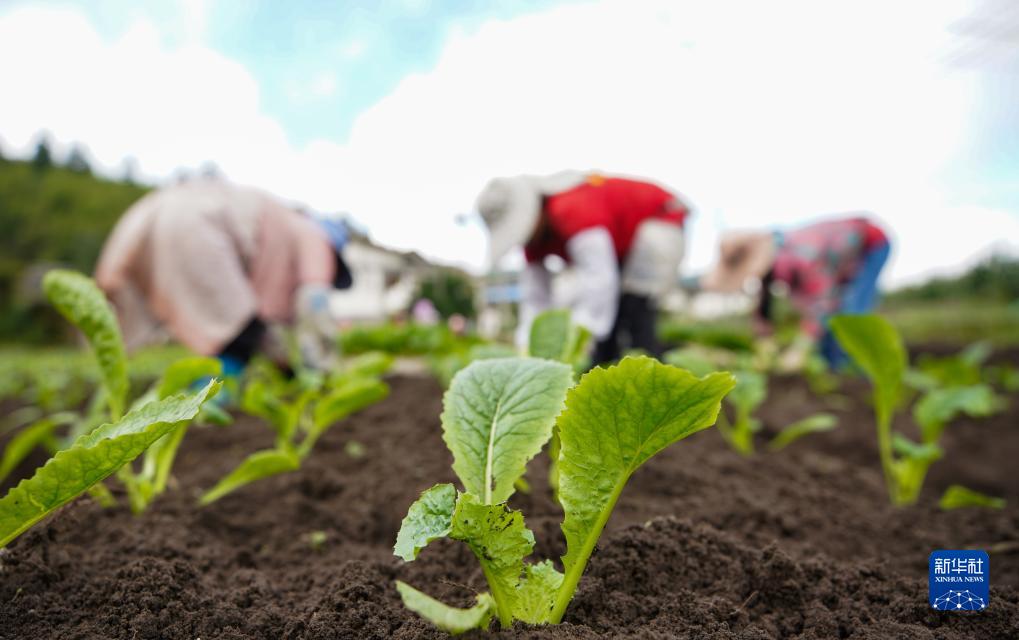 8月8日,貴州省黔南布依族苗族自治州都勻市毛尖鎮坪陽村的村民在栽種蔬菜。