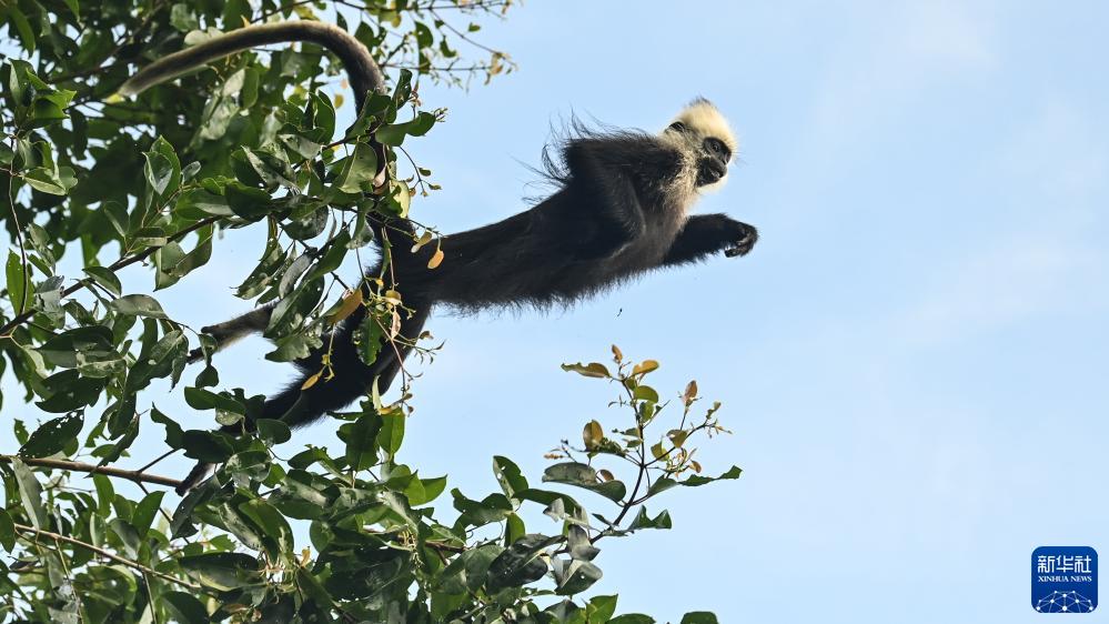 在崇左市江州區羅白鄉的白頭葉猴國家級自然保護區,一隻白頭葉猴在蹬離樹梢飛躍(8月5日攝)。