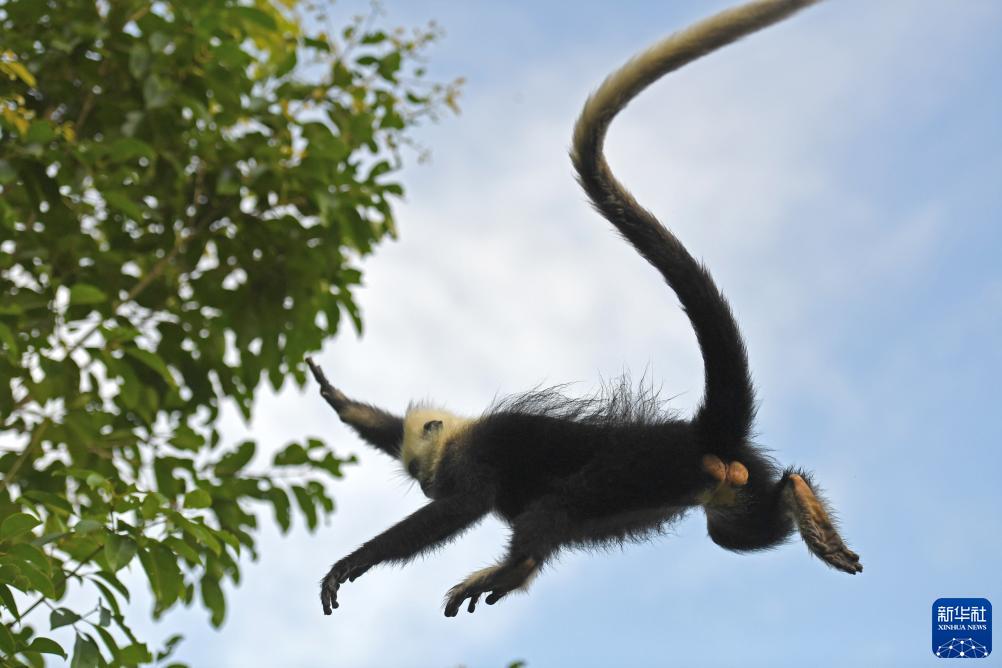 在崇左市江州區羅白鄉的白頭葉猴國家級自然保護區,白頭葉猴在林間飛躍(8月5日攝)。