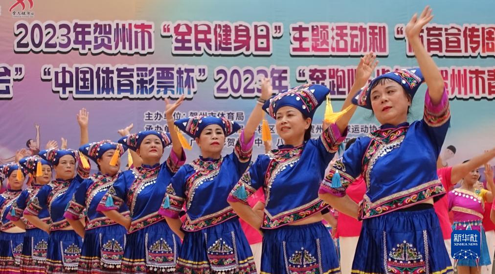 8月8日,市民在廣西賀州市體育館表演民族健身舞。