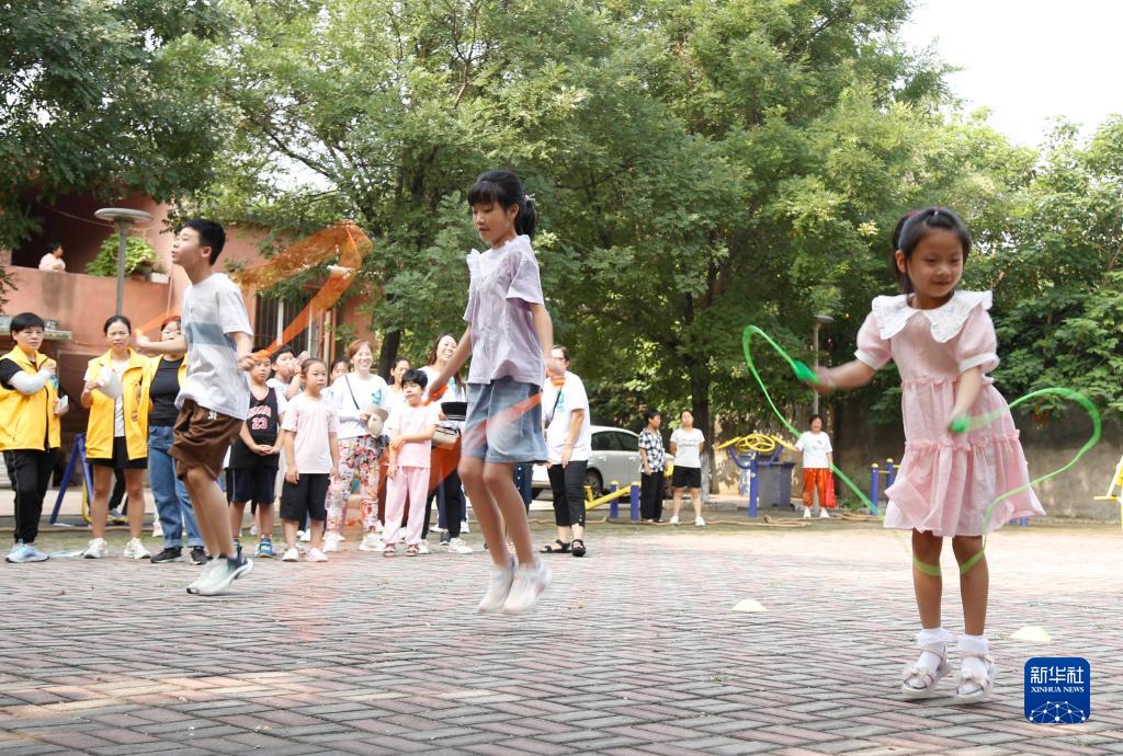 8月8日,小朋友在河北省邢&市襄都區大梁莊鄉社區廣場跳繩。