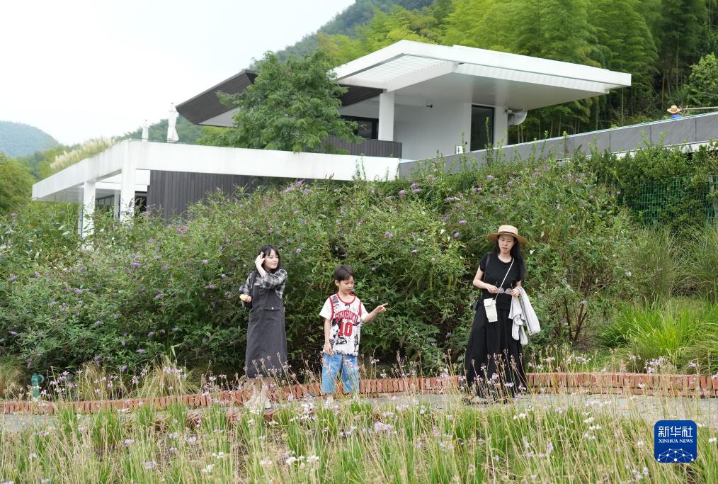 8月8日,游客在余姚市鹿亭鄉一家民宿的花園內觀光。